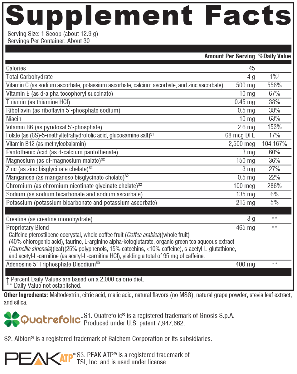 ATP Ignite™ Workout is designed to meet the demanding needs of the body during and after exercise. This great-tasting drink mix provides a low-carb, zero-sugar combination of bioactive B vitamins, electrolytes, Albion® chelated trace minerals, key amino acids, herbs, powerful antioxidants, and a unique blend of natural exercise enhancers to fuel muscular excitability and promote recovery—without the use of artificial sweeteners.*