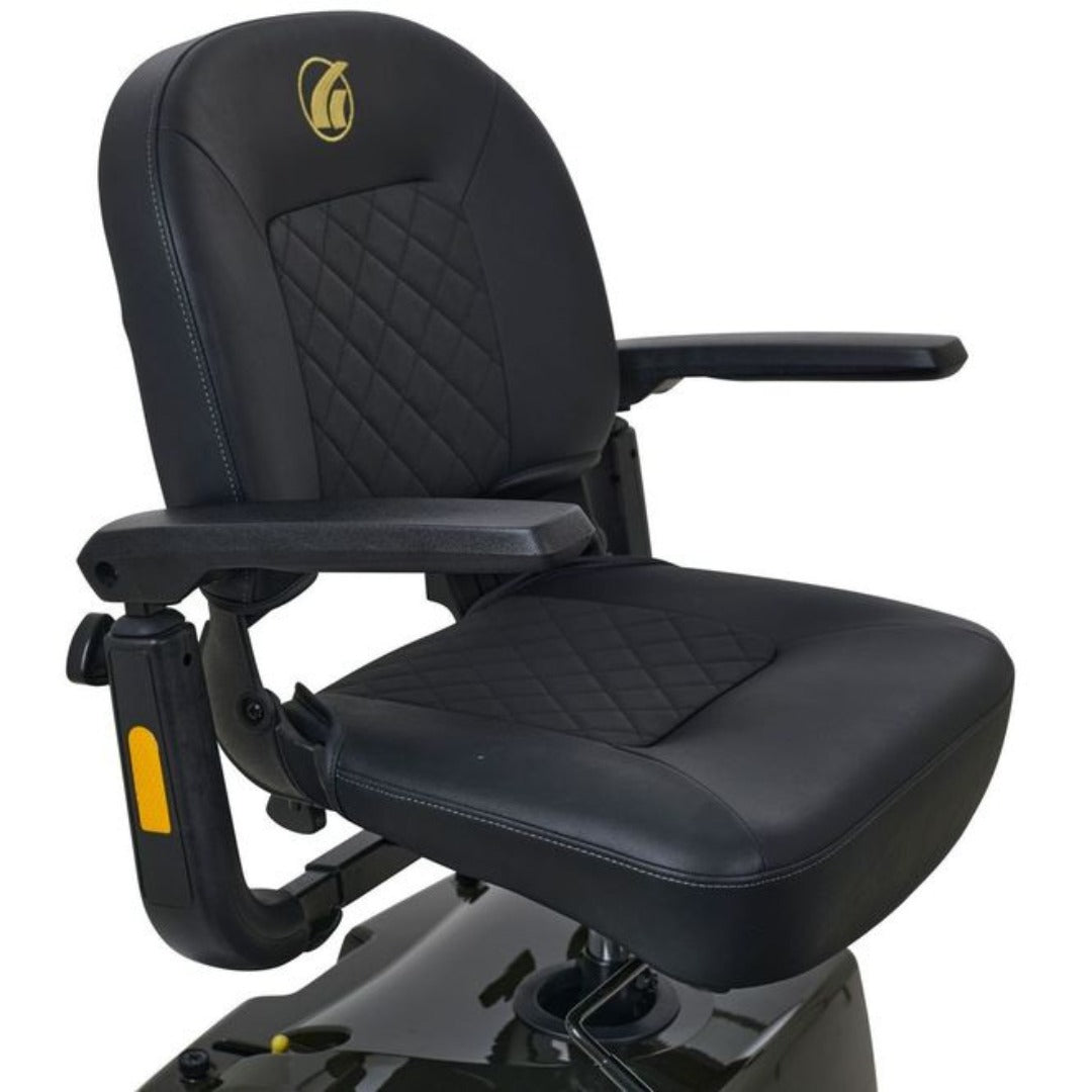 El popular scooter de 4 ruedas Companion de Golden tiene un nuevo aspecto deportivo y características de comodidad mejoradas. Este modelo de próxima generación tiene un timón ajustable infinitamente más ancho y bien diseñado con un tablero digital que cuenta con un indicador de porcentaje de vida útil de la batería y botones resistentes al agua en el panel de control, además de dos prácticos portavasos. Ofrece el mayor espacio para las piernas y los pies de su clase con un diseño moderno y resistente y suspensión delantera y trasera completa para un andar suave. El lujoso asiento estilo estadio con respaldo alto con un patrón de puntadas de diamante acolchado y acolchado adicional eleva el nivel de comodidad y estilo mientras se está en movimiento. El asiento giratorio deslizante tiene 18" de ancho por 16" de profundidad. Las cubiertas duraderas de colores vibrantes rojo, azul y gris se suman al estilo deportivo. Otras características incluyen un desmontaje fácil, un paquete de iluminación delantera y trasera con reflectores laterales y ruedas nuevas. Las baterías U1 estándar ofrecen una autonomía de 14 millas por carga. Una batería opcional de 50 AH ofrece una autonomía extendida. El Companion GC440 es resistente, confiable y tiene una excelente relación precio-calidad para un scooter de 4 ruedas portátil y de uso permanente.