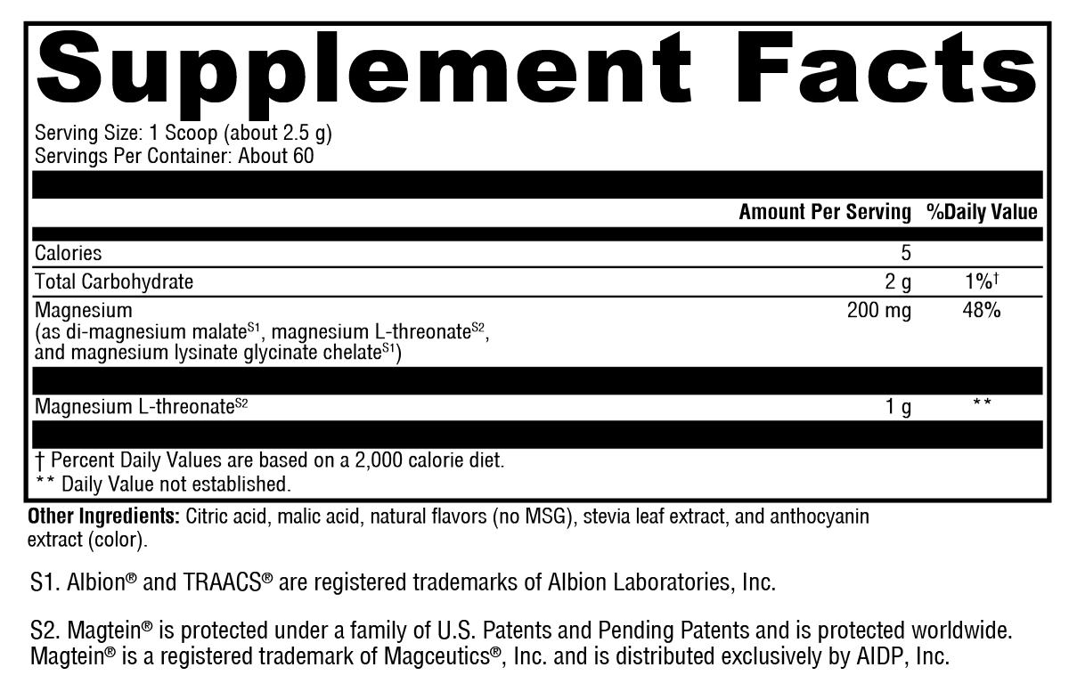 OptiMag® Neuro features magnesium L-threonate (as Magtein®), the only form of magnesium known to cross the blood-brain barrier. Complemented by highly absorbable Albion® di-magnesium malate and TRAACS® magnesium lysinate glycinate chelate, this formula is designed to boost the brain’s magnesium level. Magnesium is vital to supporting brain health and promoting healthy nervous system functions.*