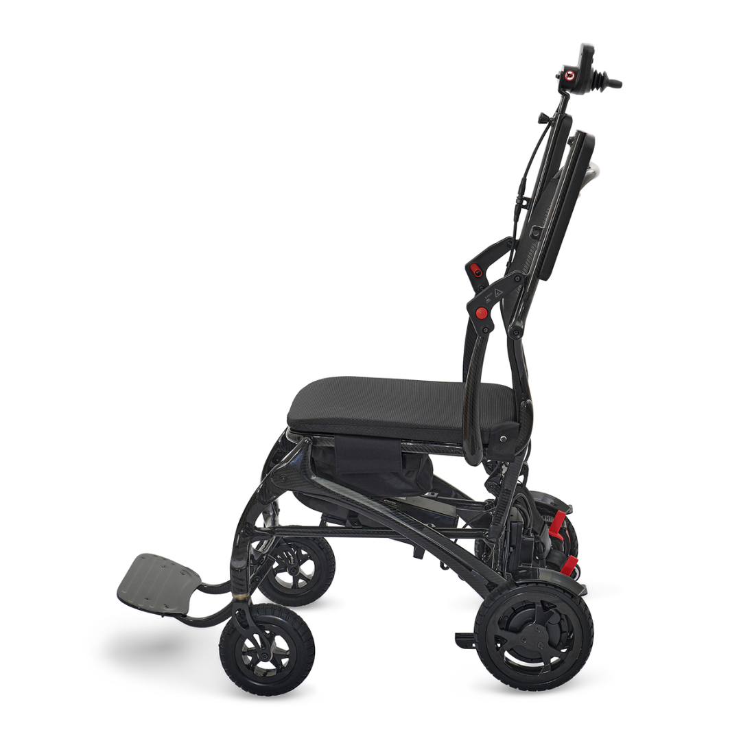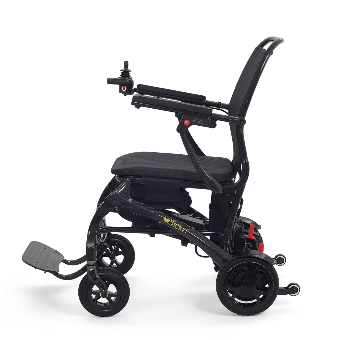 The all-new Cricket Power Wheelchair is stylish, agile, and extremely portable. Crafted with an incredibly strong yet lightweight 100% carbon fiber frame, the Cricket weighs as light as 33 lbs.*, making travel a breeze! The slim sporty design is perfect for navigating indoors and out while sightseeing, shopping, or dining. The roomy padded seat cushion and durable mesh back align with the natural curves of your body providing long-lasting comfort while on the go. The Cricket features a well-styled joystick designed to make everyday tasks easier such as driving up to a table or maneuvering through a doorway. It has an impressive 22” turning radius and offers a 300 lb. weight capacity, maximum speed of 3.7 mph, and an operating range of up to 9.3 miles on airline-approved 12 AH 24V lithium-ion batteries. It also offers convenient offboard charging and folds effortlessly for transport. The Cricket offers excellent performance and portability for your active lifestyle!